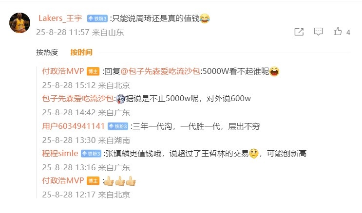 有网友表示广东队去年卖周琦给北京队卖了不止5000万,付政浩回复:“5000W看不起谁呢。”