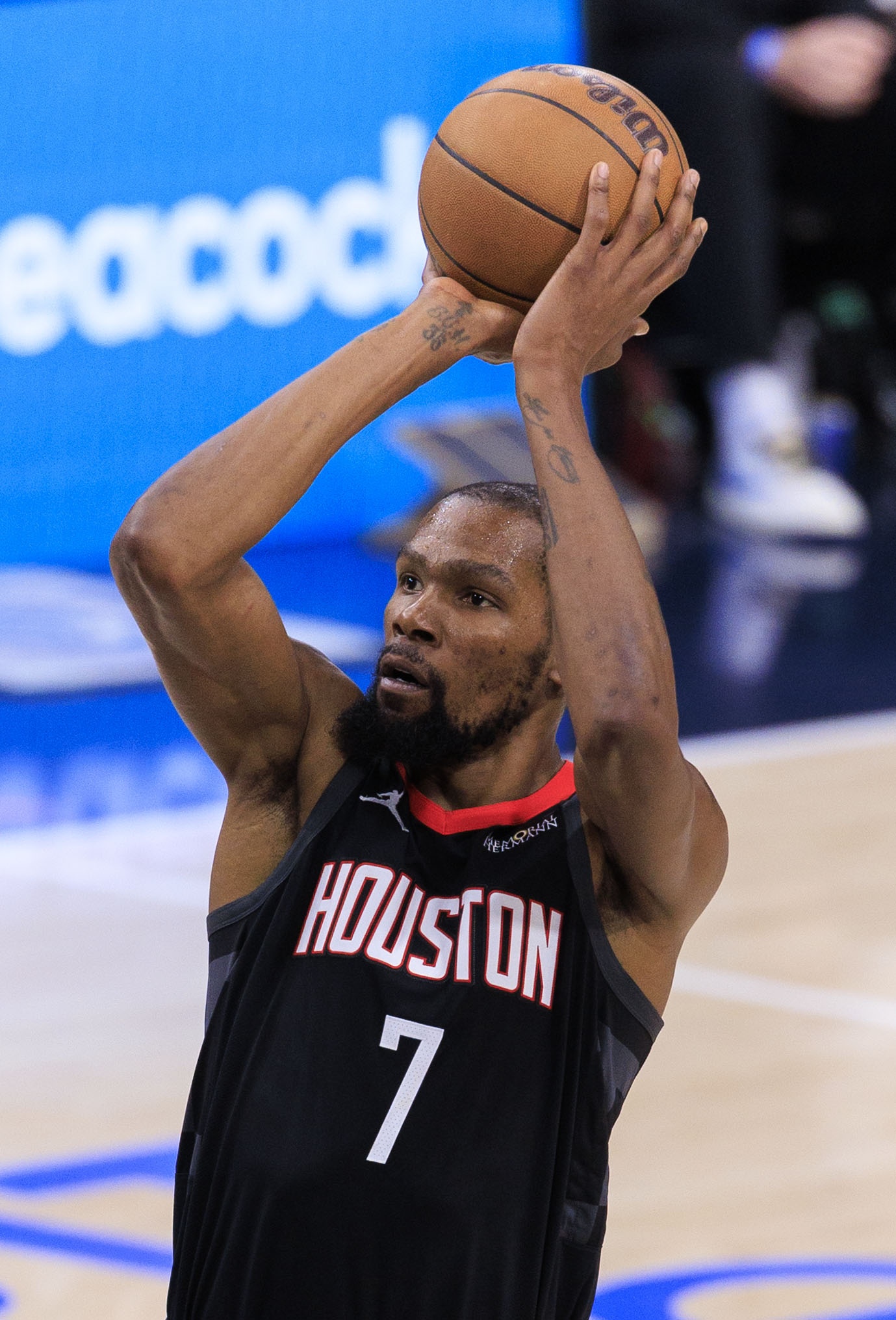 火箭的进攻思路非常明确,防守给什么就拿什么,主打杜兰特+海王挡拆二人转启动,利用杜兰特的牵制力,火箭其他人进行4打3